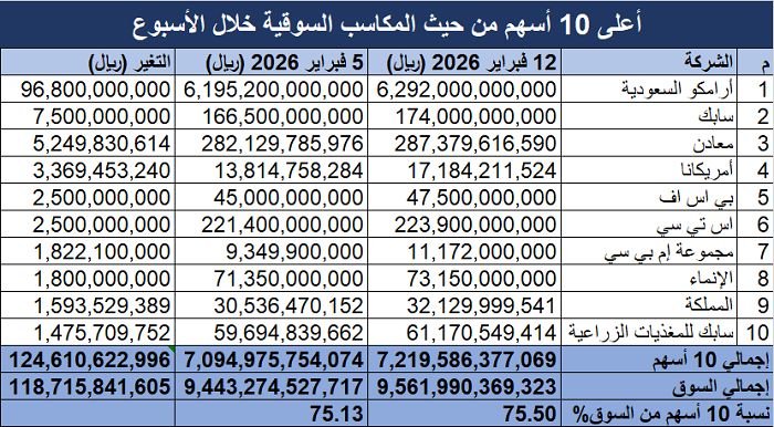 واقتنصت أعلى 10 أسهم من حيث المكاسب السوقية نحو 75.5% من رأس المال السوقي لإجمالي الأسهم المدرجة بـ "تداول"، خلال الأسبوع الحالي المنتهي في 12 فبراير 2026.