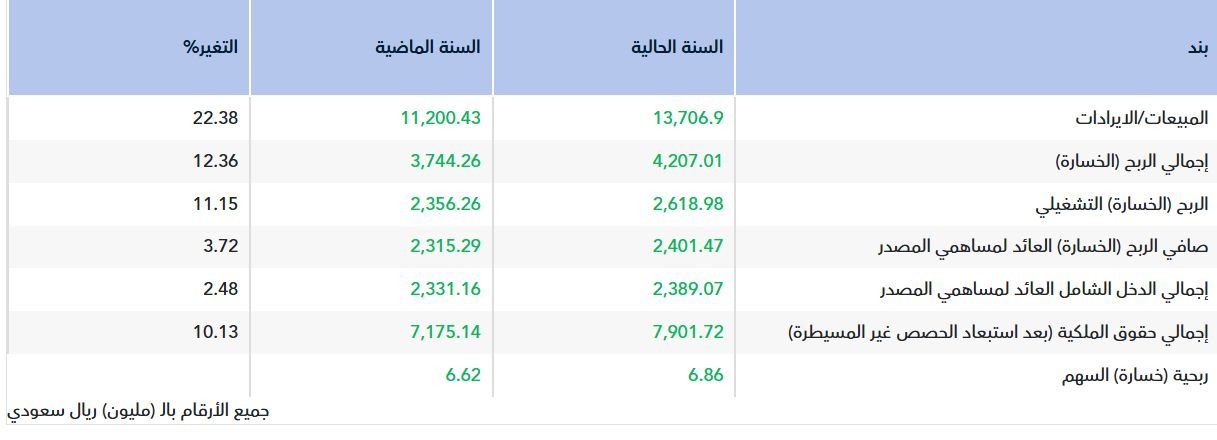 وارتفع إجمالي الدخل الشامل العائد لمساهمي الشركة إلى 2.39 مليار ريال، مقابل 2.33 مليار ريال في عام 2024.