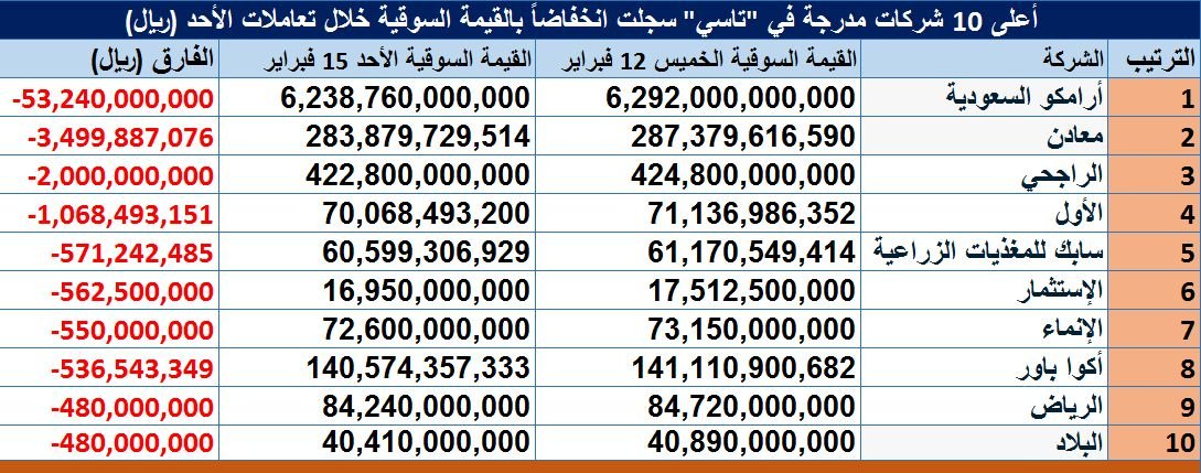 وسجلت "أرامكو السعودية" أعلى تراجع في القيمة السوقية بين الشركات المدرجة في مؤشر "تاسي" بنهاية أولى تعاملات الأسبوع؛ حيث انخفضت بواقع 53.24 مليار ريال، يليها "معادن" بتراجع يقدر بـ 3.5 مليار ريال، ثم "الراجحي" بتراجع يبلغ 2 مليار ريال.