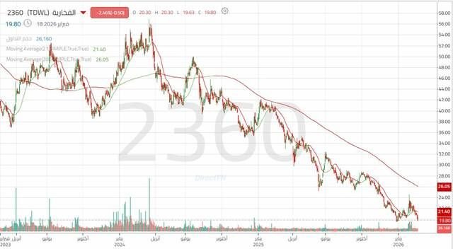 بدأ سهم الفخارية تداولاته خلال عام 2025 عند مستوى مرتفع نسبياً مع أحجام تداول ضعيفة مما أدى إلى دخول في حركة عرضية في شهر يناير. بداية من شهر فبراير، ظهر ضعف واضح في السلوك السعري، حيث تعرض السهم لضغوط بيعية حتى شهر ديسمبر. وبدايةً من شهر يناير عام 2026 بدأ السعر في محاولة الصعود إلا أن تعرض السعر لضغوط بيعية في فبراير مكملاً الاتجاه الهابط.