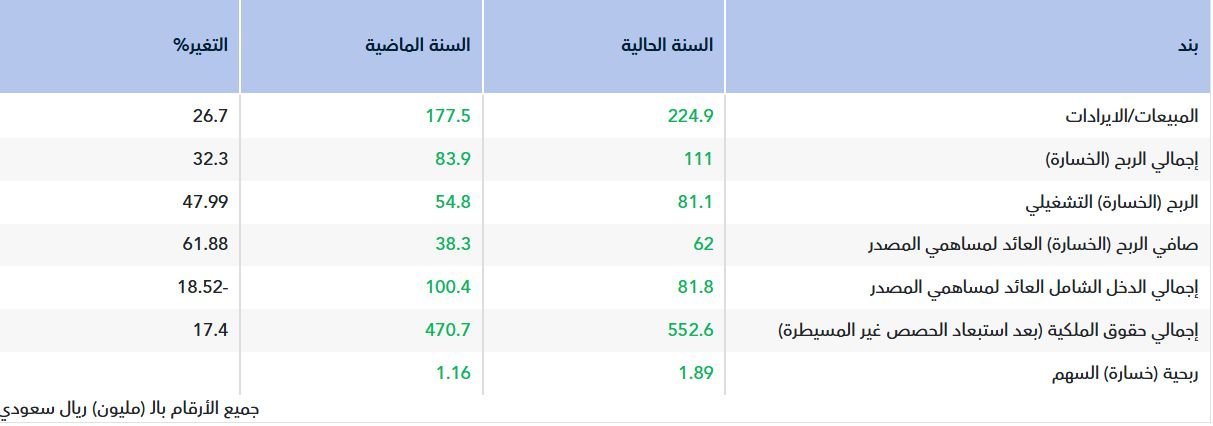 ووفقاً لبيانات الشركة المالية، الصادرة على موقع "تداول" اليوم الخميس، بلغ صافي الربح 62 مليون ريال، مقابل 38.3 مليون في الفترة المقارنة للعام الماضي.