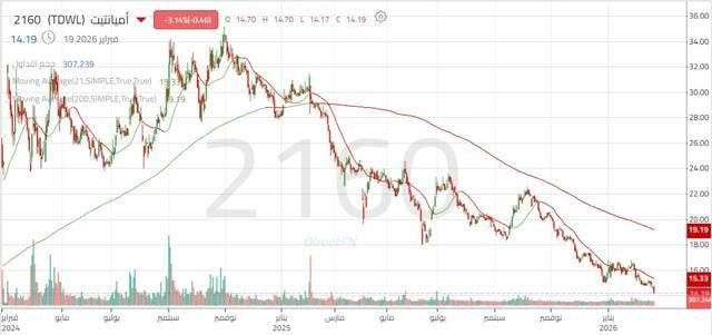 إلا أن السهم تعرض لاحقاً لضغوط بيعية قوية بدءاً من شهر فبراير 2025، واستمرت هذه الضغوط حتى شهر فبراير 2026؛ ليدخل في اتجاه هابط ممتد حتى بلغ مستوى 14.60 ريال، في إشارة إلى سيطرة الاتجاه الهابط على المدى المتوسط.