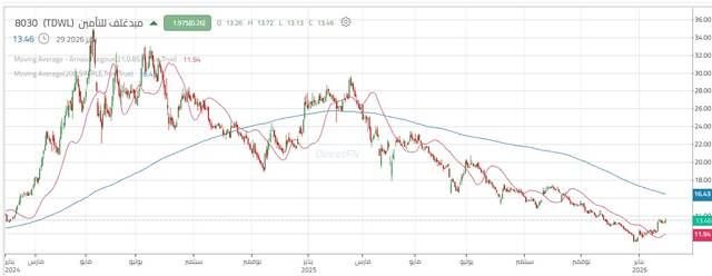 وشهد سهم ميدغلف للتأمين أداءً إيجابياً خلال يناير 2025؛ لكنه فقد الزخم الإيجابي لاحقاً، حيث كون قمماً سعرية أقل ودخل في اتجاه هابط حاد من فبراير وحتى ديسمبر 2025.