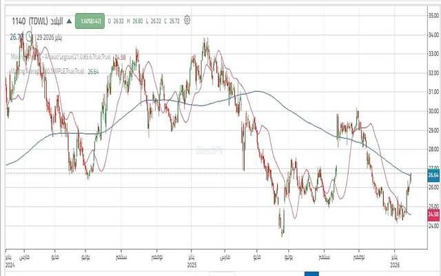 ودخل السهم في اتجاه عرضي بداية من شهر يوليو/ تموز حتى أول شهر سبتمبر/ أيلول ونجح السعر في الخروج من النطاق العرضي في النصف الثاني من شهر سبتمبر/ أيلول حتى شهر أكتوبر/ تشرين الأول، ولكن القوى الشرائية لم تكن كافية لمواصلة الاتجاه وبدأ السهم في التراجع من شهر نوفمبر/ تشرين الثاني حتى شهر ديسمبر/ كانون الأول ونجح السهم مؤخراً في شهر يناير/ كانون الثاني من عام 2026 في الصعود مخترقاً مستويات مقاومة هامة.