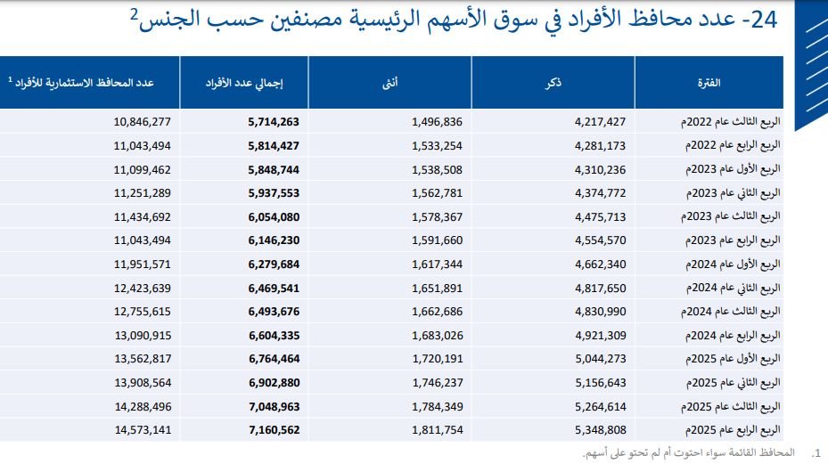 وزاد عدد المستثمرين الأفراد بسوق الأسهم (من الذكور والإناث) ليبلغ 7.16 مليون مستثمرا بنهاية الربع الرابع من عام 2025م، مقابل 6.6 مليون مستثمرا بنهاية الربع المماثل من عام 2024م؛ ليزيد عددهم بواقع 556.23 ألف مستثمر جديد وبنمو نسبته 8.4% على أساس سنوي.