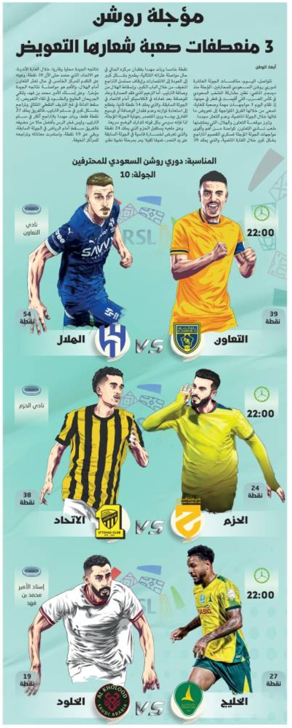 وعلى ملعبه يستقبل الحزم الذي يملك 24 نقطة والذي تعرض لخسارة قاسية في الجولة السابقة على يد النصر، ضيفا ثقيلا يمر بمرحلة نشوة نظير نتائجه الجيدة محليا وقاريا خلال الفترة الأخيرة، هو الاتحاد، الذي حصد حتى الآن 38 نقطة، وعينه على التقدم للمركز الخامس في حال تعثر التعاون أمام الهلال، والأهم هو مواصلة نتائجه الجيدة مؤخرا.