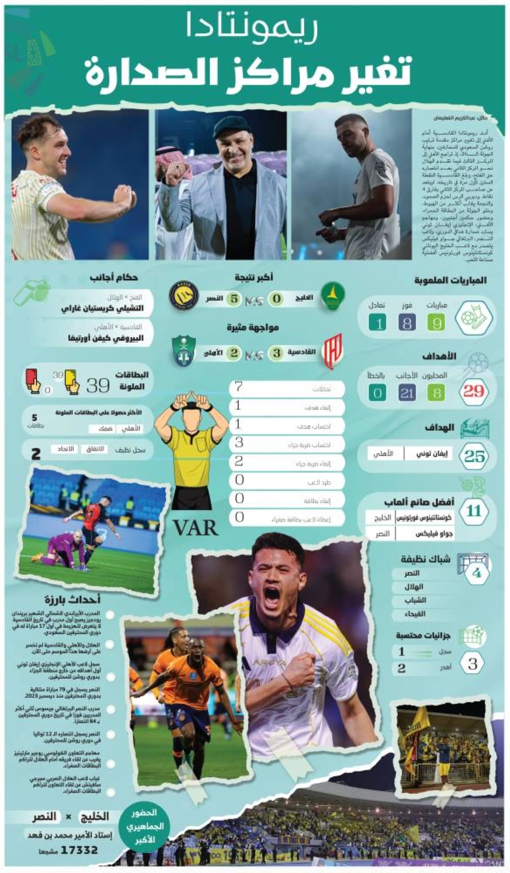هذا الخبر يأتيكم برعاية موقع عيون الجزيرة الاخباري ويتمنى لكم قضاء وقت ممتع في قراة هذا الخبر أدت ريمونتادا القادسية أمام الأهلي إلى تغيير مراكز مقدمة ترتيب روشن السعودي للمحترفين، بنهاية الجولة الـ26، إذ تراجع الأهلي إلى المركز الثالث فيما تقدم الهلال نحو المركز الثاني بعد انتصاره على الفتح، وبلغ القادسية النقطة الستين لأول مرة في تاريخه، ليبتعد عن صاحب المركز الثاني بفارق 4 نقاط. وديربي الرس لحزم الصمود، والنجمة يقترب أكثر من الهبوط، وخلو الجولة من البطاقة الحمراء، وحضور حكمين أجنبيين، ومهاجم الأهلي، الإنجليزي إيفان توني يسترد صدارة هدافي الدوري، ولاعب النصر، البرتغالي جواو فيليكس يتصدر مع لاعب الخليج اليوناني كونستانتينوس فورتونيس أفضلية صناعة اللعب.