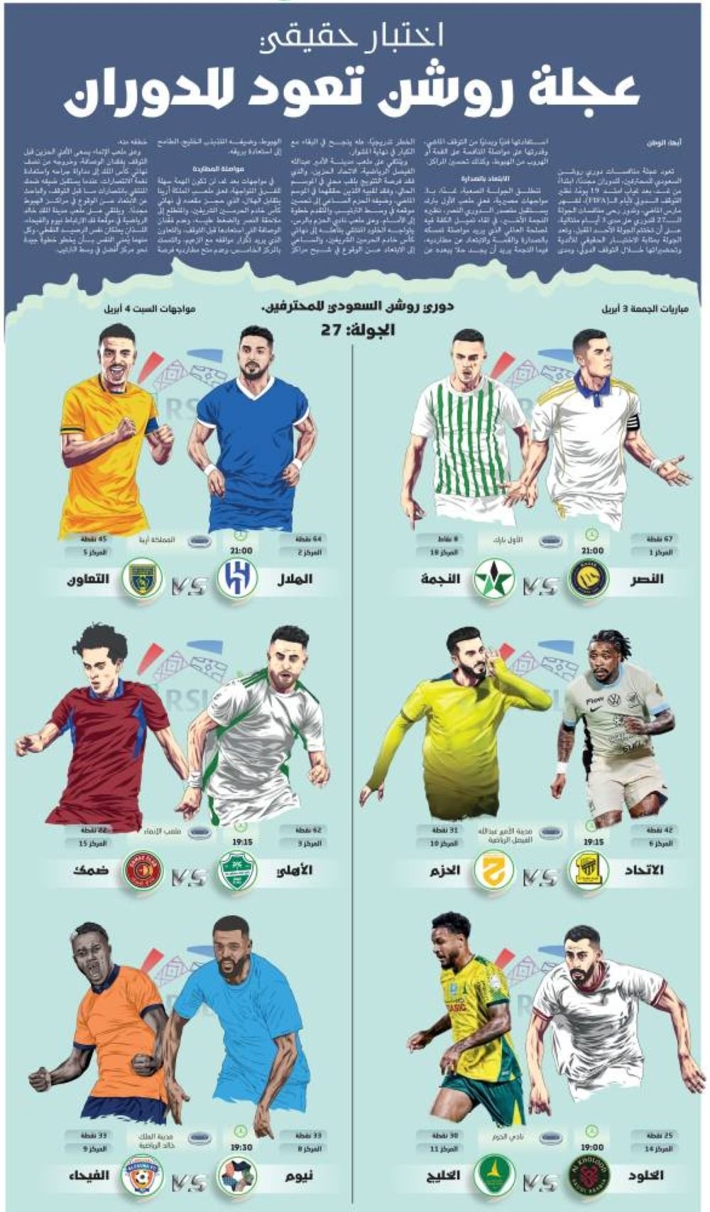 وعلى ملعب الإنماء يسعى الأهلي الحزين قبل التوقف بفقدان الوصافة، وخروجه من نصف نهائي كأس الملك إلى مداواة جراحه واستعادة نغمة الانتصارات، عندما يستقبل ضيفه ضمك المنتشي بانتصارات ما قبل التوقف، والباحث عن الابتعاد عن الوقوع في مراكز الهبوط مجددًا. ويلتقي على ملعب مدينة الملك خالد الرياضية في موقعة فك الارتباط نيوم والفيحاء، اللذان يملكان نفس الرصيد النقطي، وكل منهما يُمني النفس بأن يخطو خطوة جيدة نحو مركز أفضل في وسط الترتيب.
