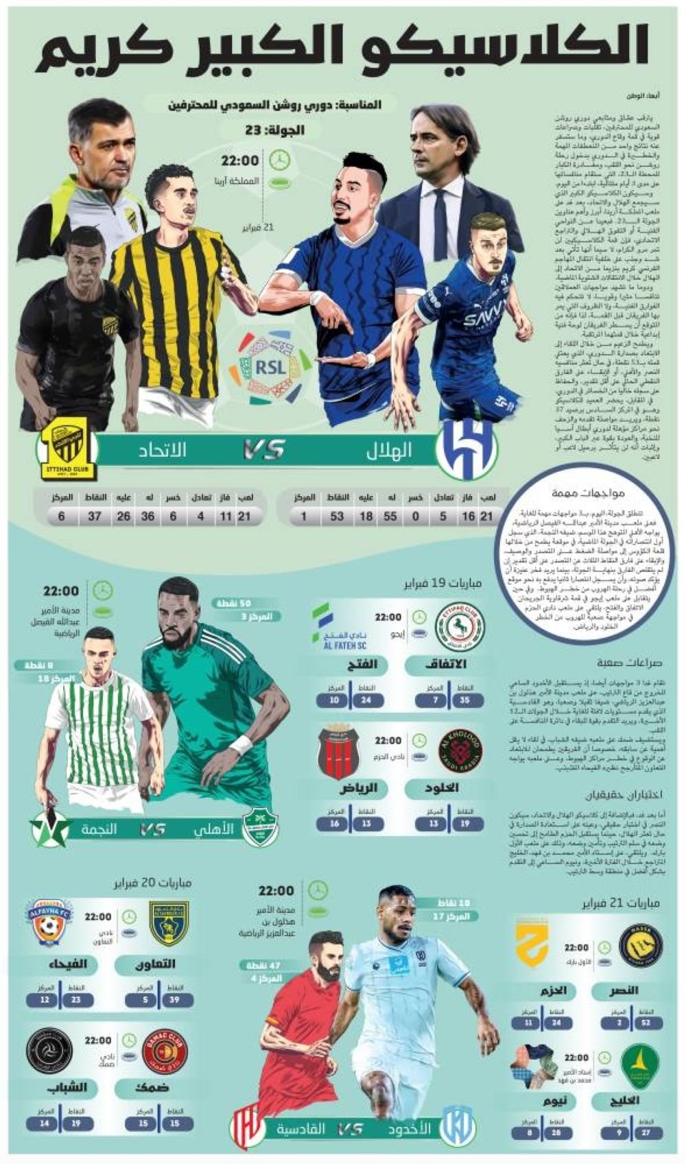 وسيكون الكلاسيكو الكبير الذي سيجمع الهلال والاتحاد، بعد غد على ملعب المملكة آرينا، أبرز وأهم عناوين الجولة الـ23. فبعيدا عن النواحي الفنية أو التفوق الهلالي والتراجع الاتحادي، فإن قمة الكلاسيكيين لن تمر مرو الكرام، لا سيما أنها تأتي بعد شد وجذب على خلفية انتقال المهاجم الفرنسي كريم بنزيما من الاتحاد إلى الهلال خلال الانتقالات الشتوية الماضية.